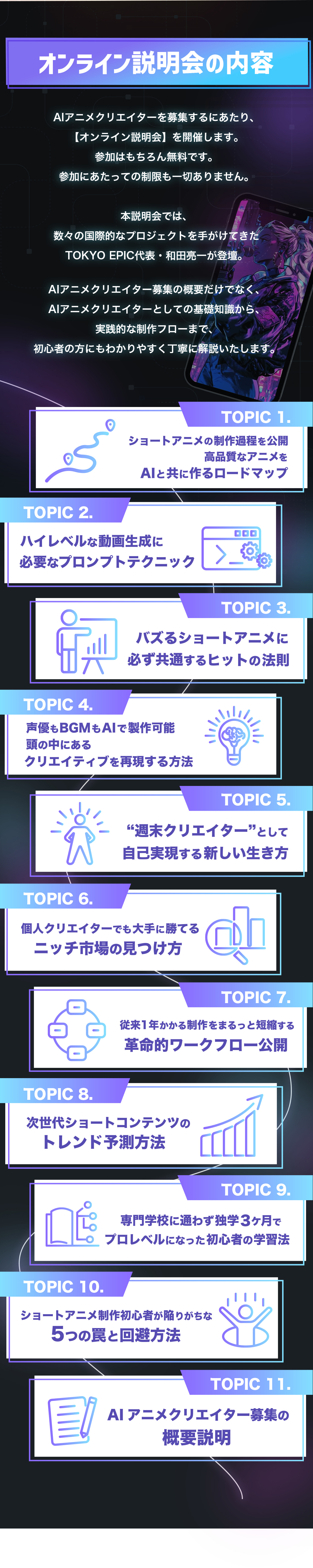 「アニメが作りたい…」という思いさえあれば、未経験で知識ゼロでも、ショートアニメを作るためのフローや知識を知り、AI活用のコツやルールを掴めば、AIアニメクリエイターを目指すことが可能です。